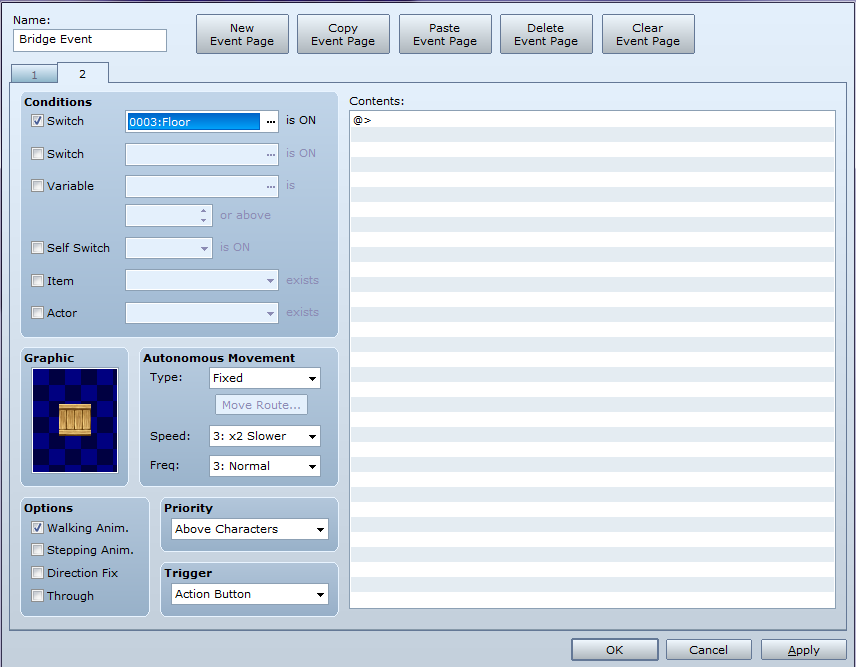 Next, create a graphic-less event. Set the Priority to "Below Characters" and "Trigger" to "Player Touch." When the player touches the graphic, set the switch you created above to "ON."